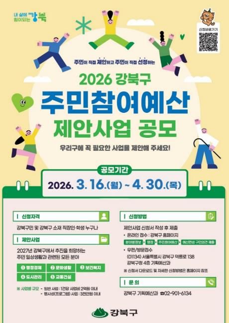 (포탈뉴스통신) 서울 강북구가 구민의 다양한 의견을 구정에 반영하기 위해 오는 4월 30일까지 ‘2026년 강북구 주민참여예산 제안사업’을 공모한다.