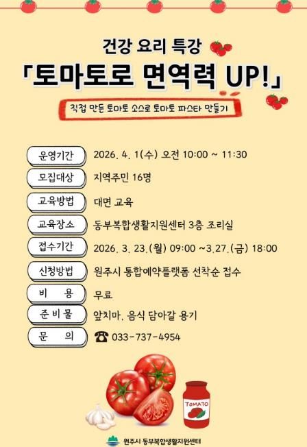 (포탈뉴스통신) 원주시 동부복합생활지원센터는 오는 23일부터 ‘토마토로 면역력 업(UP)!’ 건강 요리 특강 프로그램 참여자를 모집한다.