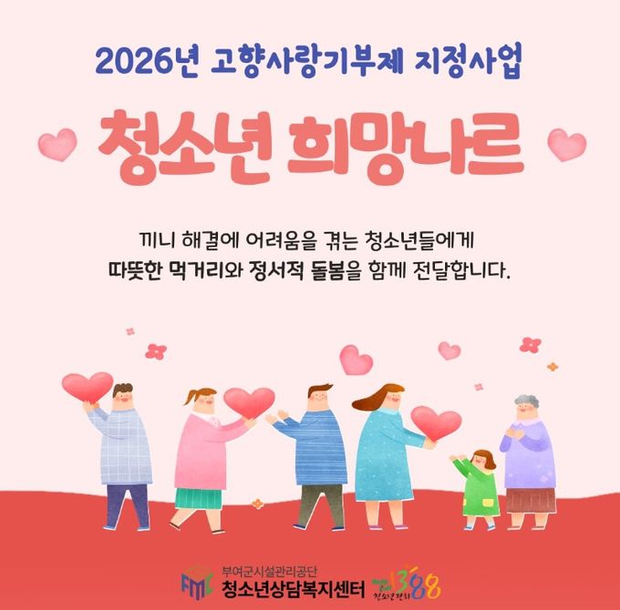 (포탈뉴스통신) 부여군시설관리공단 부여군청소년상담복지센터는 지역사회 기부금을 활용하여 돌봄 사각지대 청소년을 지원하는 고향사랑기부제 지정사업 '청소년 희망나르'를 추진한다고 밝혔다.