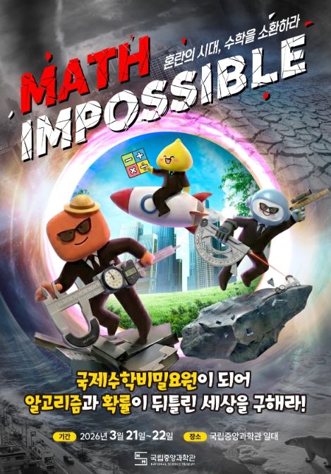 (포탈뉴스통신) 과학기술정보통신부 국립중앙과학관은 3월 21일부터 22일까지 양일간, 관람객이 주인공이 되어 수학적 사고로 위기를 극복하는 임무형(미션형) 수학 행사 ‘Math Impossible: 혼란의 시대, 수학을 소환하라!’를 개최한다.