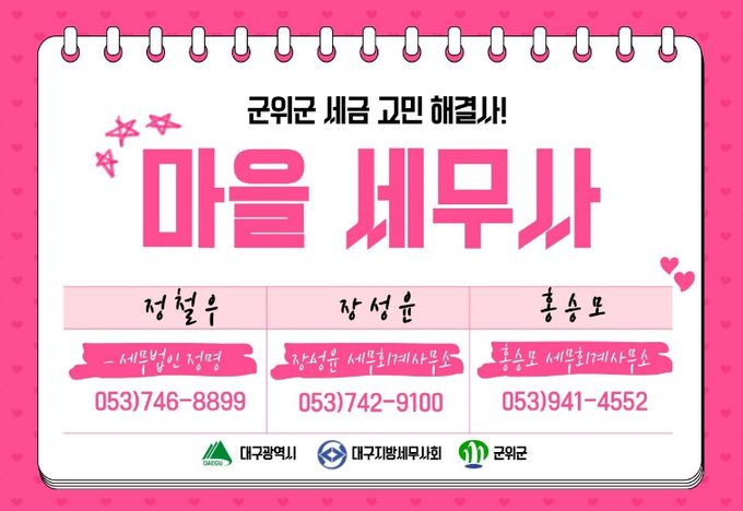 군위군은 앞으로도 마을세무사 제도를 적극 홍보해 군민들이 세금 문제로 어려움을 겪지 않도록 지원을 확대해 나갈 계획이다. 특히 영세사업자와 고령자 등 세무 상담이 필요한 군민들이 보다 쉽게 제도를 이용할 수 있도록 안내와 홍보를 강화할 방침이다.
