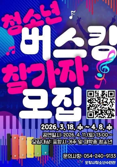 (포탈뉴스통신) 포항시청소년재단 청소년수련관은 내달 8일까지 청소년들이 자신의 끼와 재능을 마음껏 펼칠 수 있는 무대인 ‘청소년 버스킹’ 참가자를 모집한다.