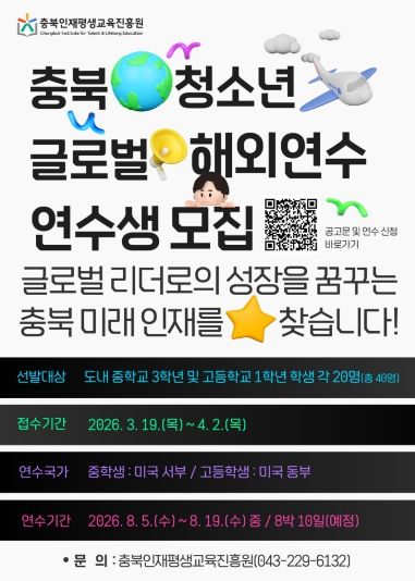 (포탈뉴스통신) 충북인재평생교육진흥원은 도내 중·고생 총 40명을 대상으로 ‘2026년 충북 청소년 글로벌 해외연수’에 함께할 연수생을 모집한다.