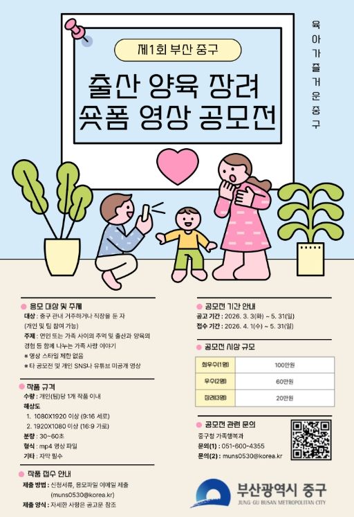 (포탈뉴스통신) 부산 중구는 출산과 양육의 긍정적인 가치를 확산하기 위해 제1회 '중구 출산·양육 장려 숏폼 영상 공모전'을 개최한다.