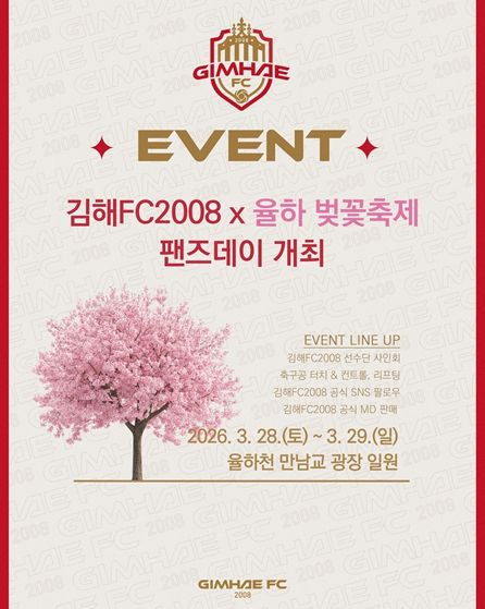 (포탈뉴스통신) 김해FC2008이 오는 28일 ‘제7회 율하 벚꽃축제’ 현장에서 팬들과 직접 소통하는 ‘팬즈데이’를 개최한다고 밝혔다.