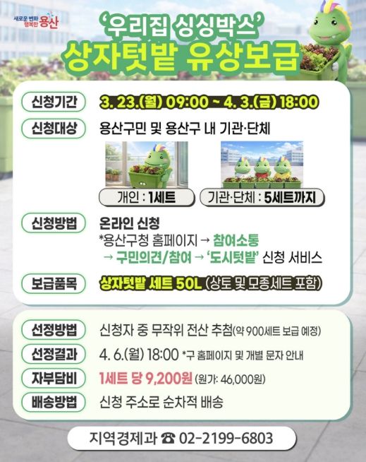 대상자는 전산 추첨을 통해 선정되며, 결과는 4월 6일 오후 6시에 개별 문자로 안내된다. 자부담금은 4월 8일 오후 6시까지 납부해야 하며, 이후 상자텃밭은 4월 20일부터 신청 주소지로 순차 배송된다.