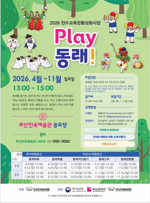 주요 프로그램은 ▲동래야류·동래학춤 등 공연과 체험이 결합한 ‘Play 동래!’ ▲자수·도자·단청 등 장인의 기술을 배우는 전통문화체험교실 ▲초등학생 대상 ‘부산농악 놀이터’ ▲다문화·어린이 참여형 ‘후리소리 전통교실’ 등으로 운영된다.
