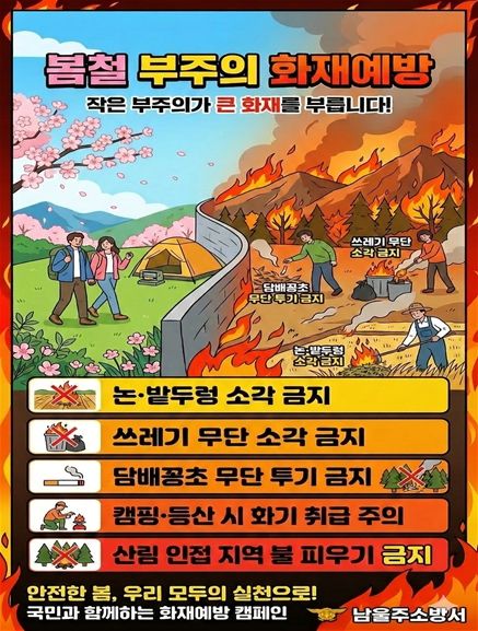 주요 화재 예방 수칙으로는 ▲논·밭두렁 소각 금지 ▲쓰레기 무단 소각 금지 ▲담배꽁초 무단 투기 금지 ▲캠핑·등산 시 화기 취급 주의 ▲산림 인접 지역 불 피우기 금지 등이다.