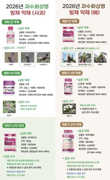 이번에 공급된 약제는 발아 전 1회, 개화기 2회 등 총 3회 살포하도록 구성됐다. 발아 전에는 사과 ‘SG세균박사’, 배 ‘코사이드’를 사용하고, 개화기에는 사과 ‘비온(1차)’, ‘부라마이신(2차)’, 배 ‘세리펠(1차)’, ‘옥싸이클린(2차)’을 시기에 맞춰 순차적으로 살포해야 한다.
