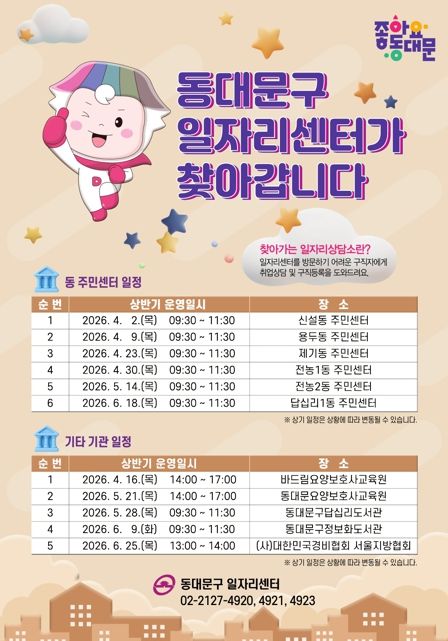 상반기 찾아가는 일자리상담소는 4월 2일부터 6월 25일까지 운영된다. 신설동, 용두동, 제기동, 전농1·2동, 답십리1동 등 6개 동 주민센터를 비롯해 직업훈련기관과 도서관(동대문구정보화도서관, 동대문구답십리도서관)까지 운영 장소를 확대해 접근성을 높였다.
