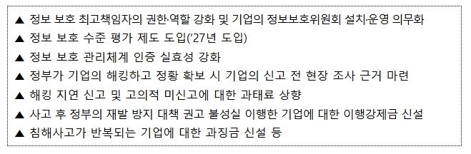 정보통신망법 개정안은 사이버 침해사고 예방부터 대응까지 전 범위를 강화하는 것을 골자로 한다. 기업의 정보 보호 역량을 높이고 관련 정보 보호 인증 체계를 강화하여 침해사고 발생을 더 효과적으로 예방할 수 있게 되며, 사고 발생이 의심되면 정부의 조사가 가능해져 사이버보안 침해사고에 더욱 빠르게 대응할 수 있게 된다. 무엇보다 침해사고로 인한 국민의 피해를 방지하기 위해서 기업의 사회적, 법적 책임을 강화하는 내용을 담고 있다.