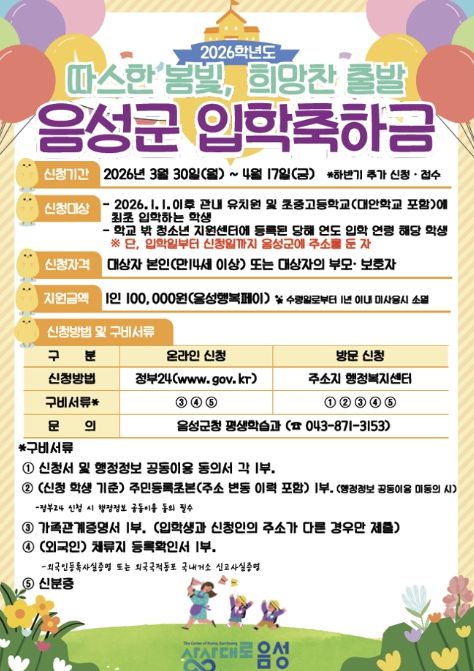 한편 지난해에는 1669명의 입학생에게 약 1억6070만원을 지급했으며, 입학축하금 관련 자세한 내용은 음성군청 누리집 공지사항을 통해 확인할 수 있다.
