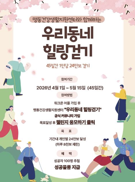 이번 챌린지는 맹동면 주민들이 일상 속 걷기를 자연스럽게 실천하고, 자발적인 신체활동을 통해 건강한 생활 습관을 형성할 수 있도록 마련됐다.