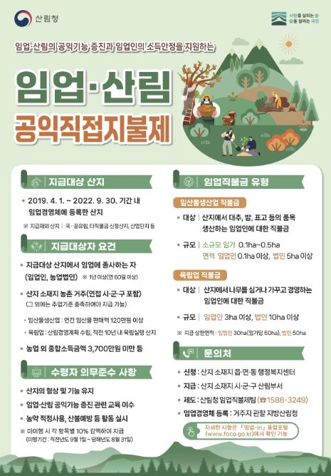 한편 임업직불제는 '임업·산림 공익기능 증진을 위한 직접지불제도 운영에 관한 법률'에 따라 2022년 10월 1일부터 시행된 제도로, 산림의 공익적 가치를 증진하고 임업인의 경영 안정을 도모하기 위한 제도다.