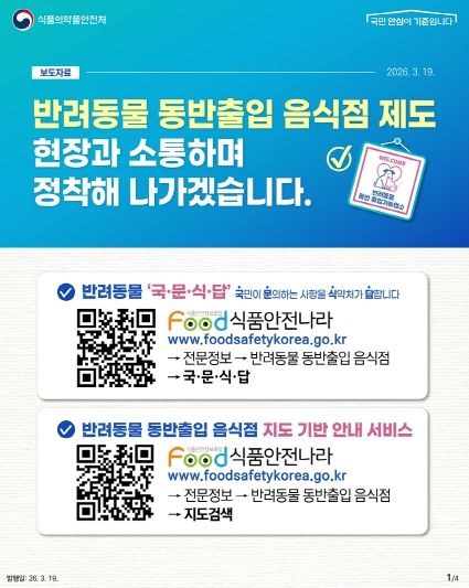 한편, 반려동물 동반 출입 음식점 현황(지도 기반 안내 서비스), 반려동물 국·문·식·답(국민이 문의하는 사항을 식약처가 답한다), 운영 매뉴얼 및 홍보자료, 질의응답 등 관련 자료는 식품안전나라 누리집에서 확인할 수 있다.