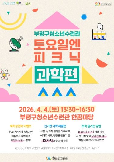 (포탈뉴스통신) 부평구청소년수련관은 오는 4월 4일 오후 1시 30분, 수련관 한꿈마당에서 과학을 주제로 ‘2026 4월 토요일엔 피크닉’을 개최한다.