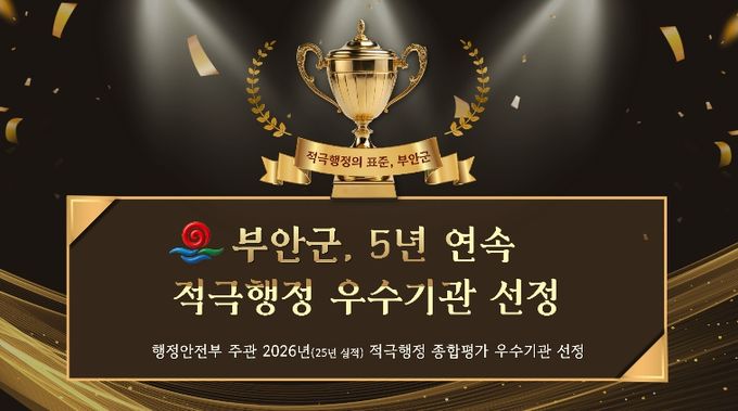 (포탈뉴스통신) 부안군은 행정안전부에서 주관한 2026년(2025년 실적) 지방정부 적극행정 종합평가에서 우수기관으로 선정돼 지난 2021년 하반기 성과 점검부터 5년 연속 우수기관 선정이라는 금자탑을 쌓았다고 밝혔다.