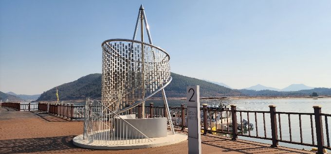 ‘파아란 하늘에 물들다’ 구간에는 데크 끝에 설치된 원형 거울을 통해 하늘과 강, 방문객의 모습이 함께 담기며, 거울 위에 새겨진 '자화상' 일부 시구가 어우러져 색다른 장면을 만들어낸다.