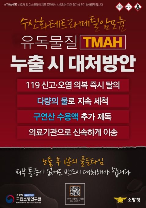 (포탈뉴스통신) 소방청은 국립소방연구원이 반도체 및 디스플레이 제조 공정에서 주로 사용되는 유독화학물질인 TMAH(수산화테트라메틸암모늄)의 누출 사고 예방을 위해, 전국 취급 사업장을 대상으로‘사고 대응 요령 홍보물(리플릿)’을 제작하여 배포한다고 밝혔다.