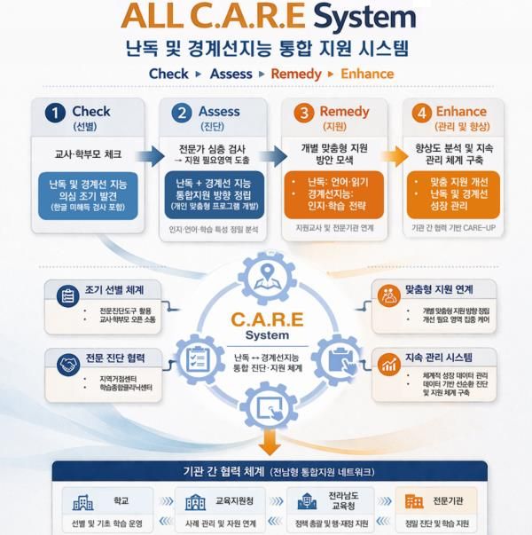 김병남 유초등교육과장은 “학생마다 학습이 늦어지는 원인이 다른 만큼, 정확한 진단을 통해 맞춤형 처방을 내리는 것이 중요하다”며, “전남의 모든 아이가 읽고 쓰는 즐거움을 알고 스스로 공부할 수 있는 힘을 기를 수 있도록 올케어(All-Care) 학습 보장 체계 교육 안전망을 만들어 가겠다”고 밝혔다.
