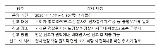 (포탈뉴스통신) 경찰청은 불법무기류로 인한 범죄와 사고를 미리 방지하기 위하여 국방부 및 행정안전부와 합동으로 4월 1일부터 30일까지 한 달간 '2026년 1차 불법무기류 자진신고 기간'을 운영한다.