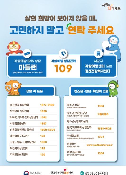 한편, 주변에 우울감으로 힘들어하거나 말하기 어려운 고민이 있어 고통받는 가족·지인이 있다면 자살예방 상담전화(109) 또는 정신건강 위기상담전화를 통해 24시간 전문가의 상담을 받을 수 있다.