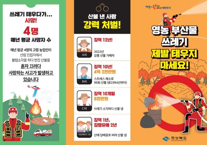 이 밖에도 경북도는 민방위 사이렌을 활용한 산불 예방 홍보 및 주민대피 계획을 수립하고 도-시․군 실시간 소통채널을 구축해 즉각적인 대응이 가능하도록 개선했으며, 기상정보와 산불 위험 지수를 매일 공유하고 산불 발생 상황을 즉시 전 시․군에 전파해 인명 피해가 발생하지 않도록 노력하고 있다.