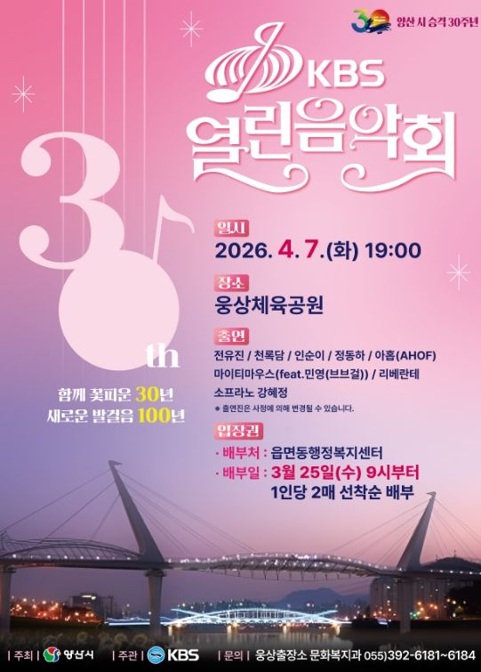 (포탈뉴스통신) 양산시가 시 승격 30주년을 기념하고 ‘2026 양산방문의 해’를 널리 알리기 위해 4월 7일(화) 저녁 7시 웅상체육공원 축구장에서‘KBS 열린음악회’를 개최한다고 밝혔다.