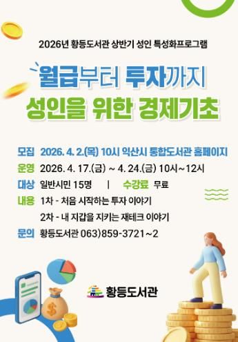 익산시 황등도서관은 오는 4월 17일과 24일, '월급부터 투자까지: 성인을 위한 경제 기초'라는 주제로 특성화 프로그램을 운영한다.
