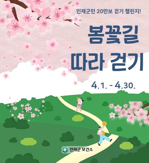 (포탈뉴스통신) 인제군이 군민의 일상 속 걷기 실천을 확산하고 건강한 생활문화를 만들기 위해 4월 1일부터 4월 30일까지 ‘4월 한달 간 20만보 걷기챌린지’를 운영한다.