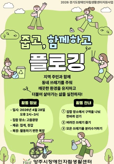플로깅[줍고, 함께하고]은 총 3회차를 진행할 예정이며, 1회차는 2026년 4월 28일 화요일 14시부터 15시까지 경기도 양주시 고읍동 일대에서 진행하며, 양주시 거주 장애인 및 비장애인 10명 내외로 참여가 가능하다.