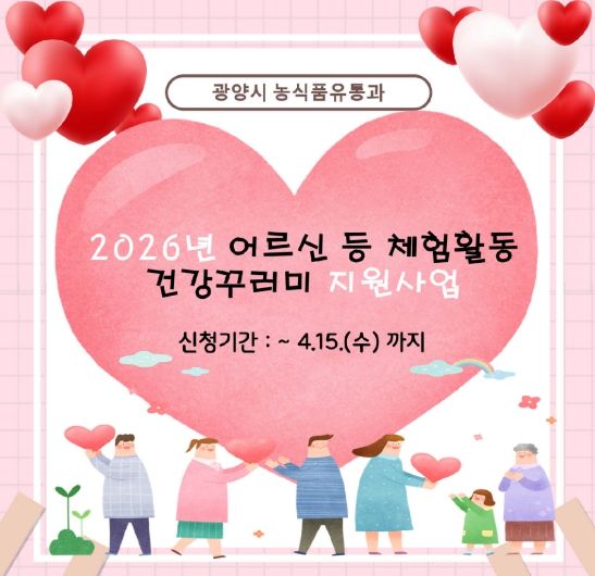 (포탈뉴스통신) 광양시가 어르신·장애인·아동 등 실외 활동이 어려운 이용자를 대상으로 ‘체험활동 건강꾸러미 지원사업’을 추진하고, 4월 15일까지 신청을 받는다.
