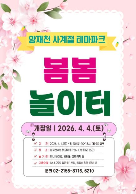 전성수 서초구청장은 “겨울철 눈썰매장으로 운영되던 양재천 공간을 봄철에는 온 가족이 즐길 수 있는 놀이공간으로 조성했다”며 “계절마다 다양한 즐길거리를 제공하는 양재천에 많은 가족들이 방문해 즐거운 시간을 보내길 바란다”고 말했다.