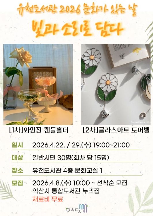 익산시는 오는 22일과 29일 유천도서관에서 '빛과 소리로 담다'를 주제로 '와인잔 캔들홀더 만들기'와 '글라스아트 도어벨 만들기' 체험을 운영한다고 2일 밝혔다.