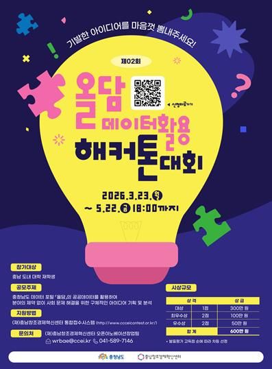 (포탈뉴스통신) 충남창조경제혁신센터는 충남도내 대학 재학생을 대상으로 공공데이터를 활용한 창의적 아이디어 발굴을 위한 '제2회 올담 데이터 활용 해커톤' 참가자를 오는 5월 22일까지 모집한다고 밝혔다.
