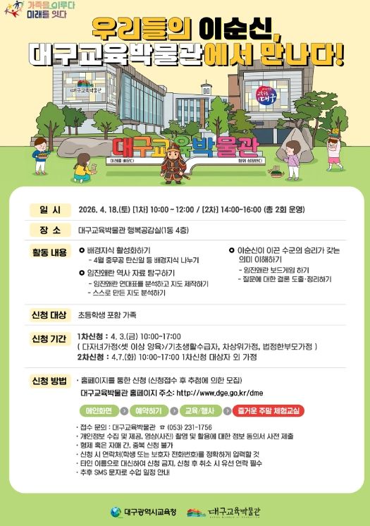 (포탈뉴스통신) 대구시교육청 산하 대구교육박물관은 충무공 이순신 장군 탄신일을 맞아, 오는 4월 18일 주말가족체험교실‘우리들의 이순신, 대구교육박물관에서 만나다’를 운영한다.