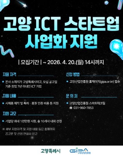 (포탈뉴스통신) 고양산업진흥원이 ‘2026년 고양 ICT 스타트업 사업화 지원사업’ 참여 기업을 모집한다.
