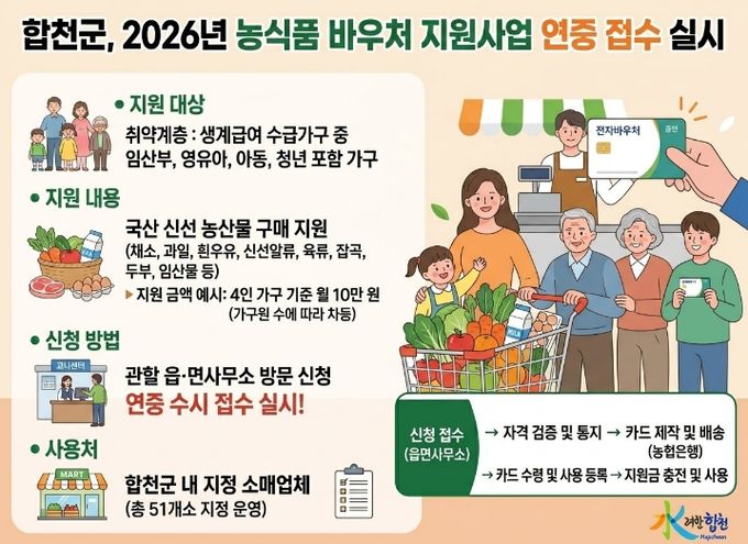 합천군 관계자는 “농식품 바우처 지원사업은 취약계층의 먹거리 기본권을 보장하는 사업”으로 “소급적용이 안되는 만큼 빠른 신청과 함께, 매월 지원금이 소멸하기 전 잊지 말고 사용해 주실 것을 당부드린다”고 말했다.