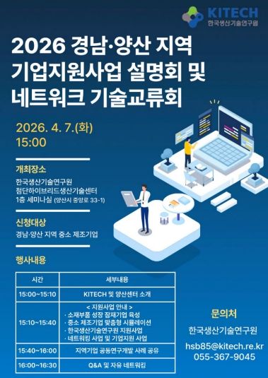 (포탈뉴스통신) 양산시는 오는 7일 한국생산기술연구원 첨단하이브리드생산기술센터 세미나실에서 지역 산업 발전 촉진과 관내 제조기업의 기술 혁신을 도모하기 위해 ‘2026년 기업지원사업 설명회 및 네트워크 기술교류회’를 개최한다고 밝혔다.