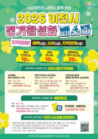 (포탈뉴스통신) 이천시는 침체된 지역경제에 활력을 불어넣기 위해 2026년 4월 3일부터 ‘2026 이천시 경기 활성화 페스타’를 본격 추진한다고 밝혔다.