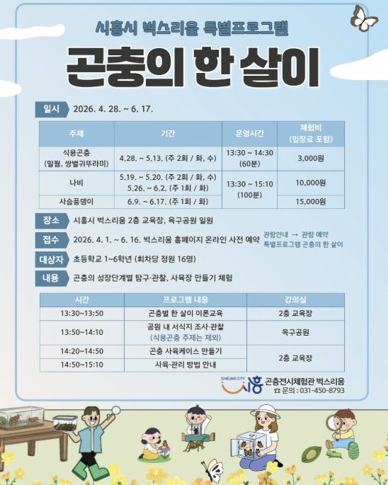 (포탈뉴스통신) 시흥시 곤충체험전시관 ‘벅스리움’은 오는 4월 28일부터 6월 17일까지 초등학생을 대상으로 특별프로그램 ‘곤충의 한 살이’를 운영한다.