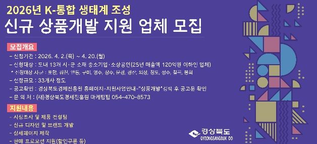 (포탈뉴스통신) 경상북도는 도내 유망 중소기업·소상공인의 제품 경쟁력 강화를 위해 ‘2026년 K-통합 마케팅 생태계 조성사업’의 일환으로 상품 기획부터 디자인·마케팅까지 전 과정을 지원하는‘신규 상품개발 지원사업’에 참여할 기업을 모집한다.