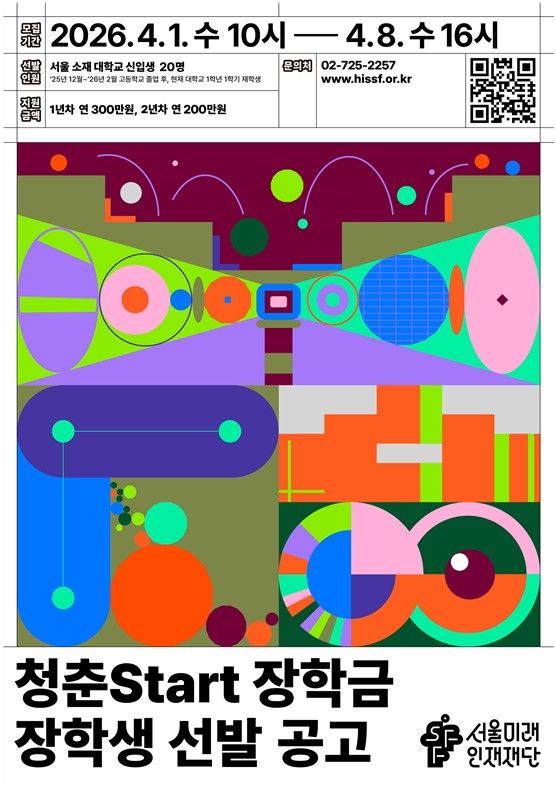 (포탈뉴스통신) 서울미래인재재단이 ㈜두산 임직원 기부금으로 14년째 운영 중인 '청춘Start장학금' 14기 장학생 20명을 모집한다. 서울 소재 대학에 올해 입학한 저소득 신입생을 대상으로 2년간 총 500만 원의 학업장려금을 지급하며, 신청은 4월 8일 16시까지 재단 누리집에서 받는다.