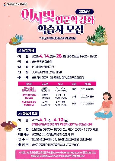 (포탈뉴스통신) 해남군교육재단은 4월 14일부터 28일까지‘해남 이사빛 인문학 강좌’를 운영한다.‘이사빛’은‘이른 아침 따스하게 비추는 햇빛’을 의미하며 따뜻하고 친근한 인문학의 빛을 전하는 군민 교육과정이다.