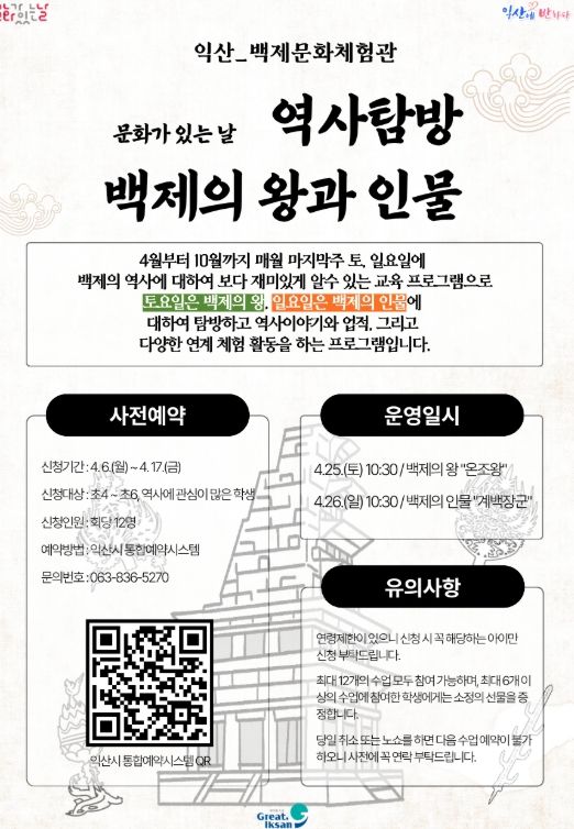 익산 백제문화체험관은 4월부터 10월까지 매월 마지막 주 토·일요일에 '역사탐방-백제의 왕과 인물'을 운영한다고 6일 밝혔다.