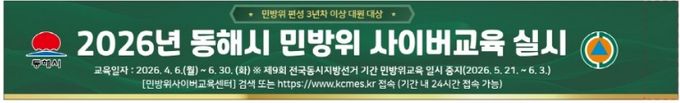 (포탈뉴스통신) 동해시는 민방위 대원의 교육 편의성을 높이고 재난 대응 역량을 강화하기 위해 오는 4월 6일부터 6월 30일까지 상반기 민방위 사이버 교육을 실시한다고 밝혔다.