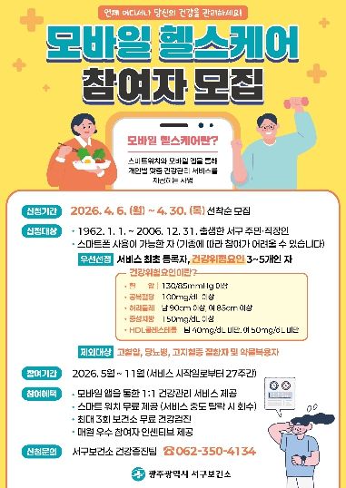 (포탈뉴스통신) 광주광역시 서구가 지역주민의 건강관리 역량 강화를 위해 정보통신기술(ICT)을 활용한 건강관리 서비스 ‘모바일 헬스케어’ 참여자 125명을 오는 30일까지 선착순 모집한다.