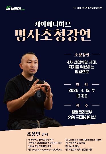 (포탈뉴스통신) K-MEDI hub가 오는 4월 15일 오전 10시 국제회의실에서 조용민 언바운드랩데브 대표를 초빙해 ‘제7회 명사초청강연’을 개최한다.