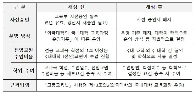 기존에는 국내 대학이 프랜차이즈를 운영하기 위해서 교육부의 사전 승인을 받아야 했으나, 2024년 2월 고등교육법 시행령 개정으로 대학 간 협약만으로도 운영이 가능해졌다. 교육과정의 구성과 수업 운영도 각 대학이 학칙으로 자율적으로 정할 수 있게 되어 현장에서 ‘프랜차이즈’ 운영의 추진력이 높아졌다.