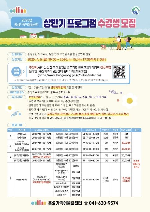 모집 기간은 2026년 4월 6일 10시부터 4월 15일 17시까지로, 접수 방법은 홍성가족어울림센터 홈페이지에서 온라인 접수로만 가능하다.